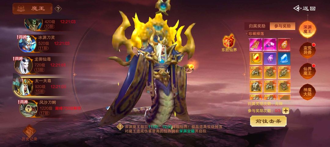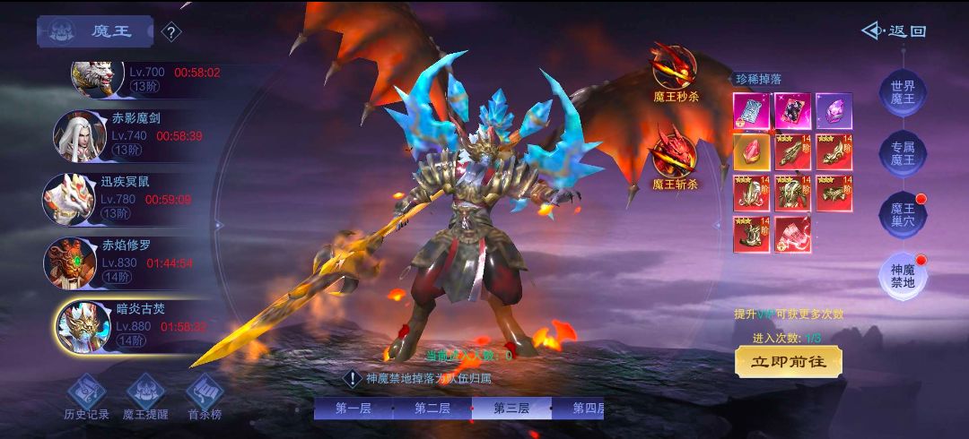 活动时间与层数:跨服深渊魔王活动每日有两次参与机会,分别在早晨11点和晚上19点刷新。根据玩家的等级,可以进入不同层数的挑战,层数越高,BOSS难度越大,但奖励也更为丰厚。