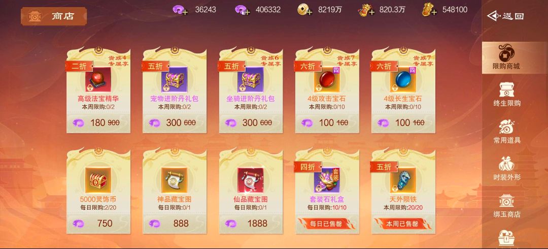 每日装备与限购商城:每日登录游戏,完成日常任务,即可在每日装备中获取套装石碎片或完整套装石。同时,限购商城也会定期上架套装石,供玩家使用仙玉购买。