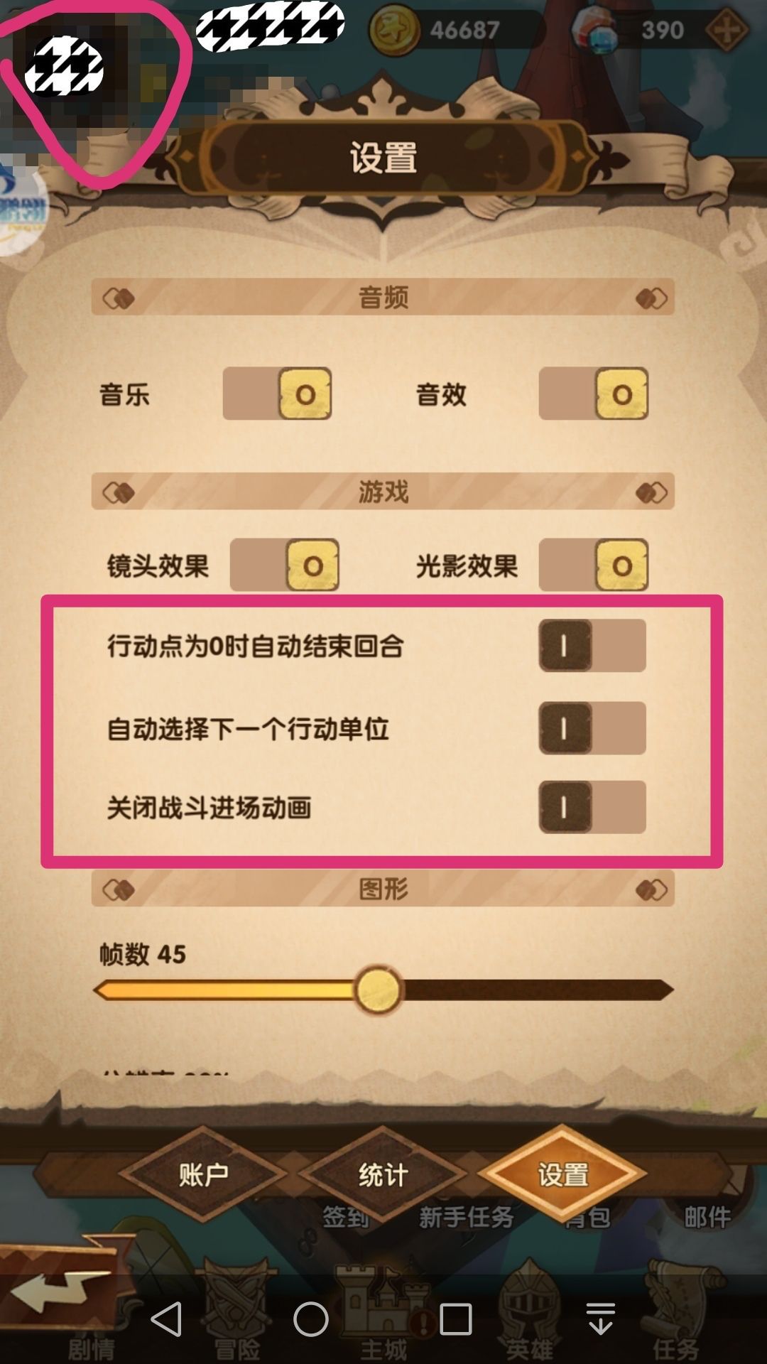 1.设置,点击左上角头像框,会弹出“设置界面”,关声音,调清晰度都在这里,需要注意的是“行动点为0结束回合”这个设置,特别是玩召唤流的玩家,关闭这个设置可以保证你行动点归零后仍然可以使用召唤物,而不是直接跳到敌方回合。