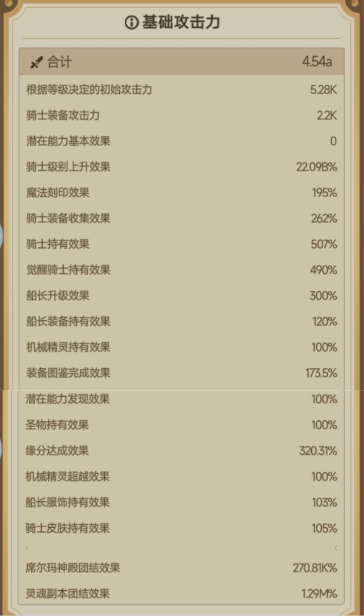 根据等级决定的初始攻击力+骑士装备攻击力=基础攻击力。后续的一切乘区都建立在这玩意之上。