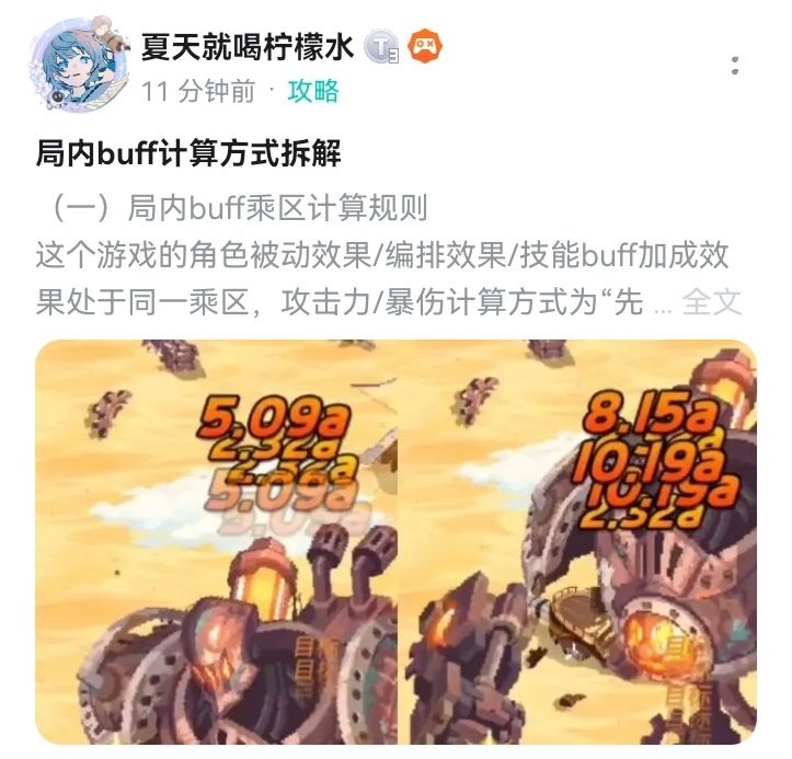 ① 这个游戏的最终攻击力/暴击伤害的计算方式为:局外基础面板×局内buff加成总和,即“先累加,再累乘”。(攻速加成方式尚未明确,但应该与此类似。)配队时只需考虑角色被动效果/编排加成效果/技能buff加成效果。