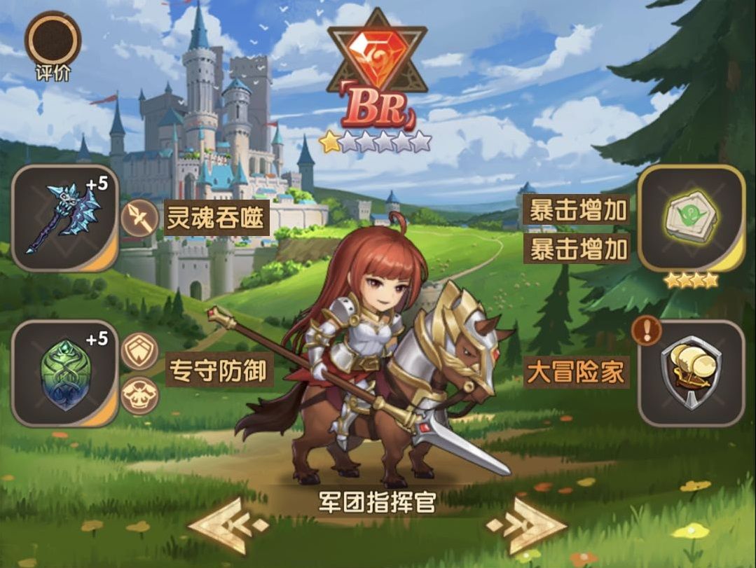 主要输出,推荐BR+6星,BR后主动技打击范围为两距全部敌人,6星增加主动技和被动技伤害,军团指挥官从不普攻所以专守防御减普攻无影响,主动技被动技自带25暴击+自带25暴击词条+纹章32暴击词条X2,可以做到百分百暴击,非常暴力,装备和衣服强满就行,称号带加属性或加攻击力的。