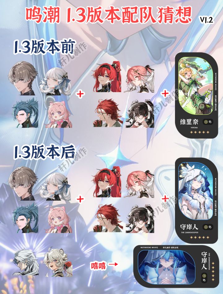 上图仅为版本前猜想,实际配队请以1.3开启后攻略为准~ 守岸人来解救维里奈了