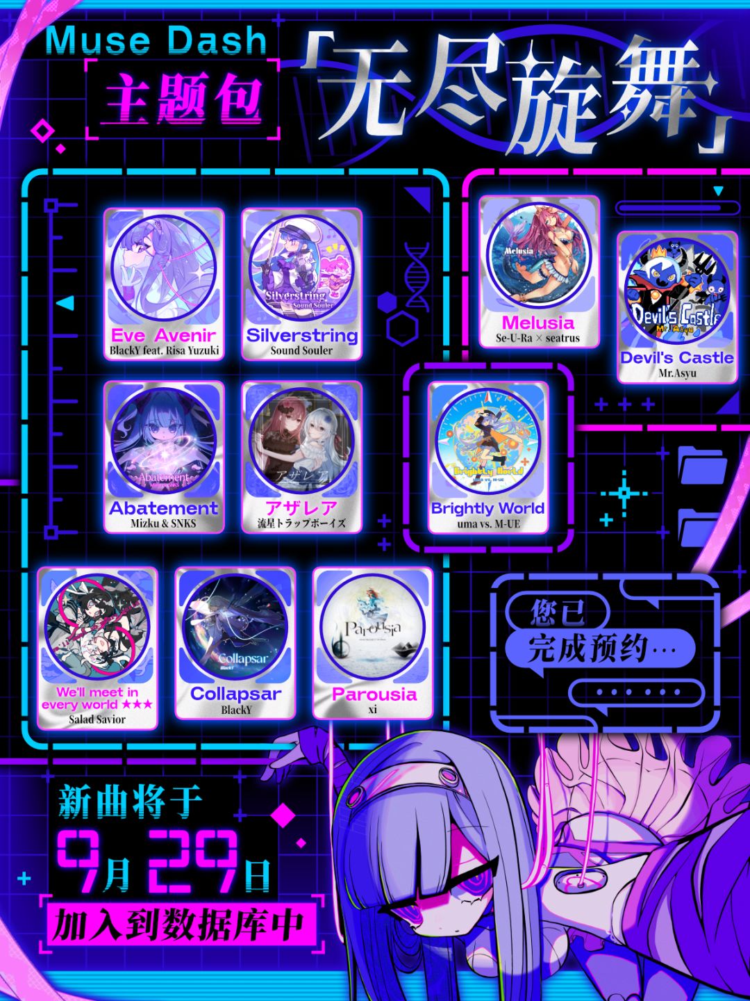 ・主题包「无尽旋舞」预约成功,将于 9 月 29 日加入到你的数据库