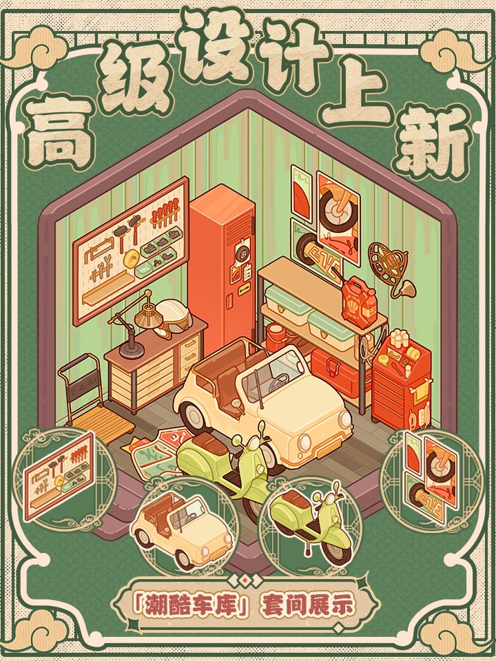 ⭐️全新套间「潮酷车库」即将来袭!10月2日-10月4日期间,在「高级设计」中使用「高级设计稿」进行设计即有概率获得「潮酷车库」套间系列家具,喜欢这套家具的小蜗千万别错过哟~