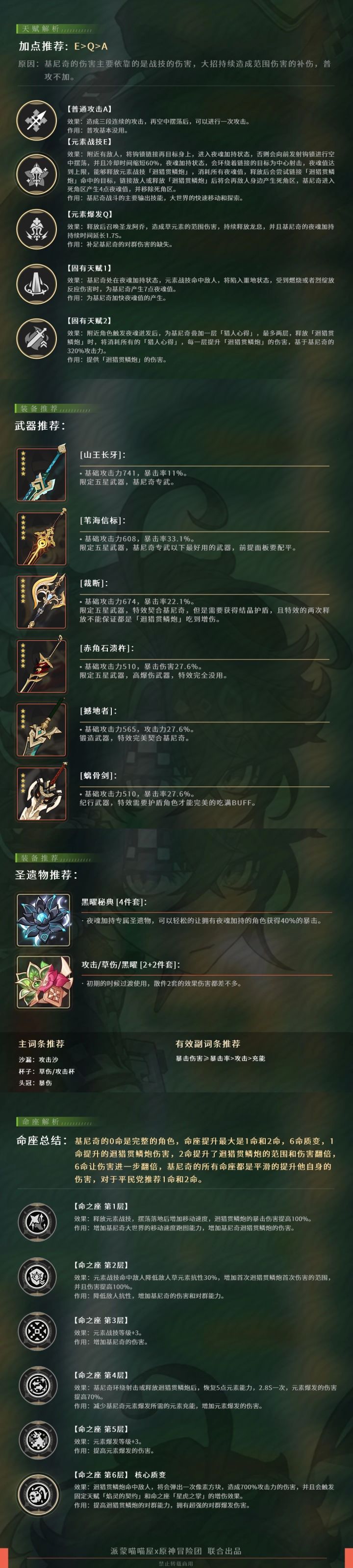 效果:附近角色触发夜魂迸发后,为基尼奇叠加一层「猎人心得」,最多两层,释放「迴猎贯鳞炮」时,将消耗所有的「猎人心得」,每一层提升「迴猎贯鳞炮」的伤害,基于基尼奇的320%攻击力