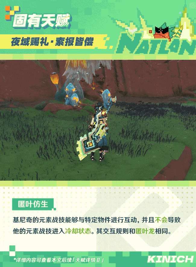 效果:基尼奇处在夜魂加持状态,元素战技命中敌人,将陷入噩地状态,受到燃烧或者烈绽放反应伤害时,为基尼奇产生7点夜魂值