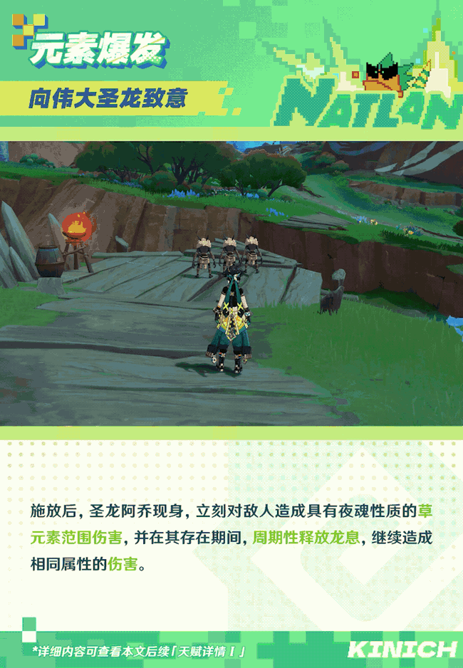 效果:释放后召唤圣龙阿乔,造成草元素的范围伤害,持续释放龙息,并且基尼奇的夜魂加持持续时间延长1.7S