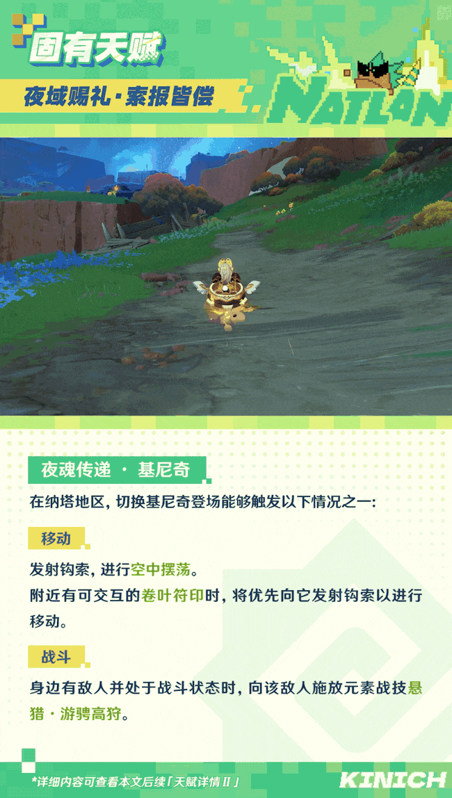 效果:通过元素战技在空中摆荡后,在纳塔地区可以消耗10点燃素再次使用空中摆荡,并且在纳塔地区可以使用夜魂传递