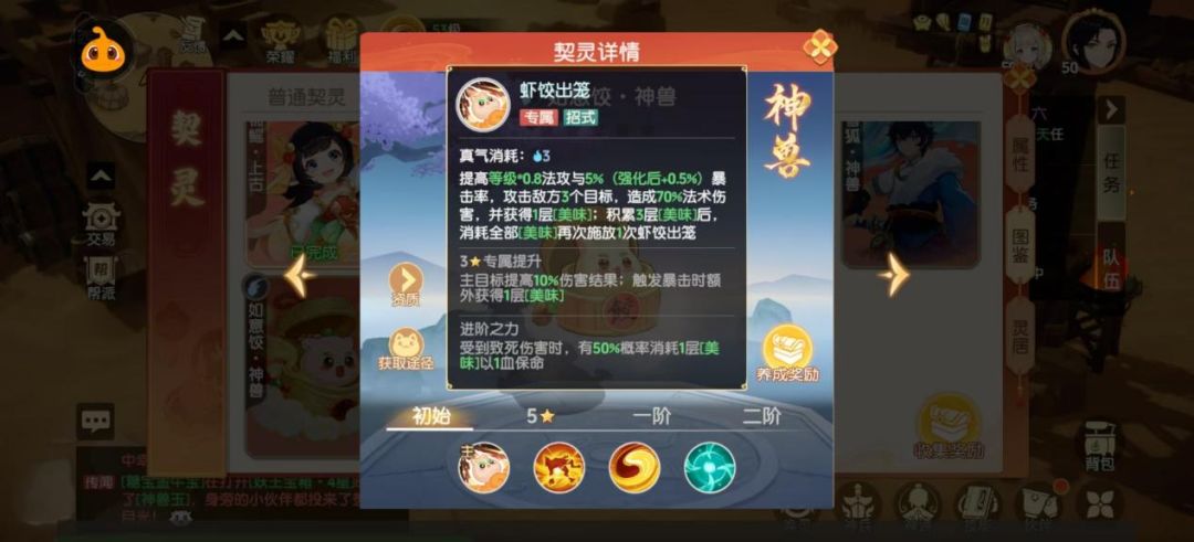 虾饺出笼基础:相较锦瑶的基础攻击,提高了5%的暴击率,另外每次攻击还可以获得美味效果,三次美味效果可以再次触发虾饺出笼。离火中没有法术连击,该技能就等于法术连击,是如意饺独有技能,且二次触发虾饺出笼的法连效果并不会减伤。