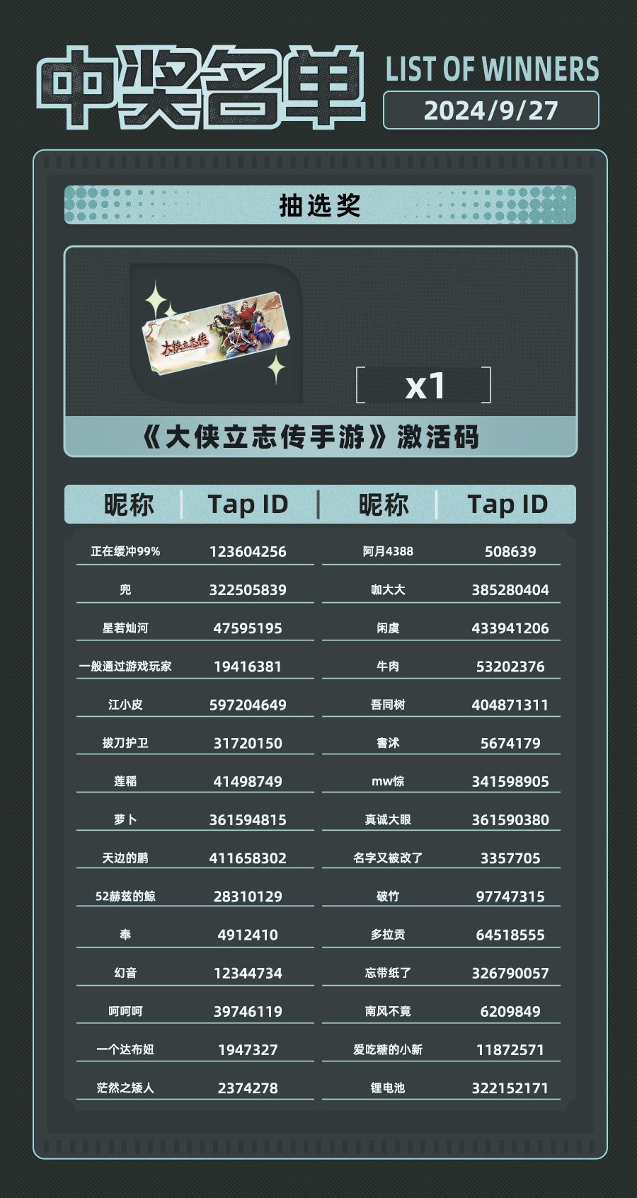——9月27日,我们会在本期资讯板的留言中,抽取30人,赠送《大侠立志传》手机版的游戏激活码*1