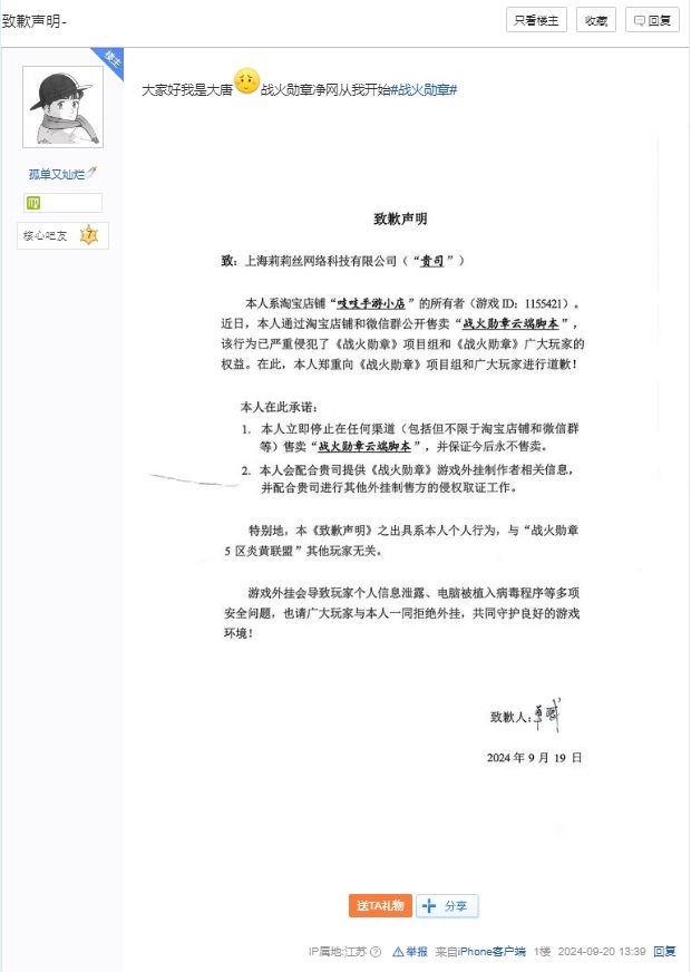 2.该玩家需在公开平台,包括但不限于战火勋章贴吧、微信群、抖音等网络平台向我方进行公开道歉,道歉声明需经我方审核,且7日内不得删除或撤销。