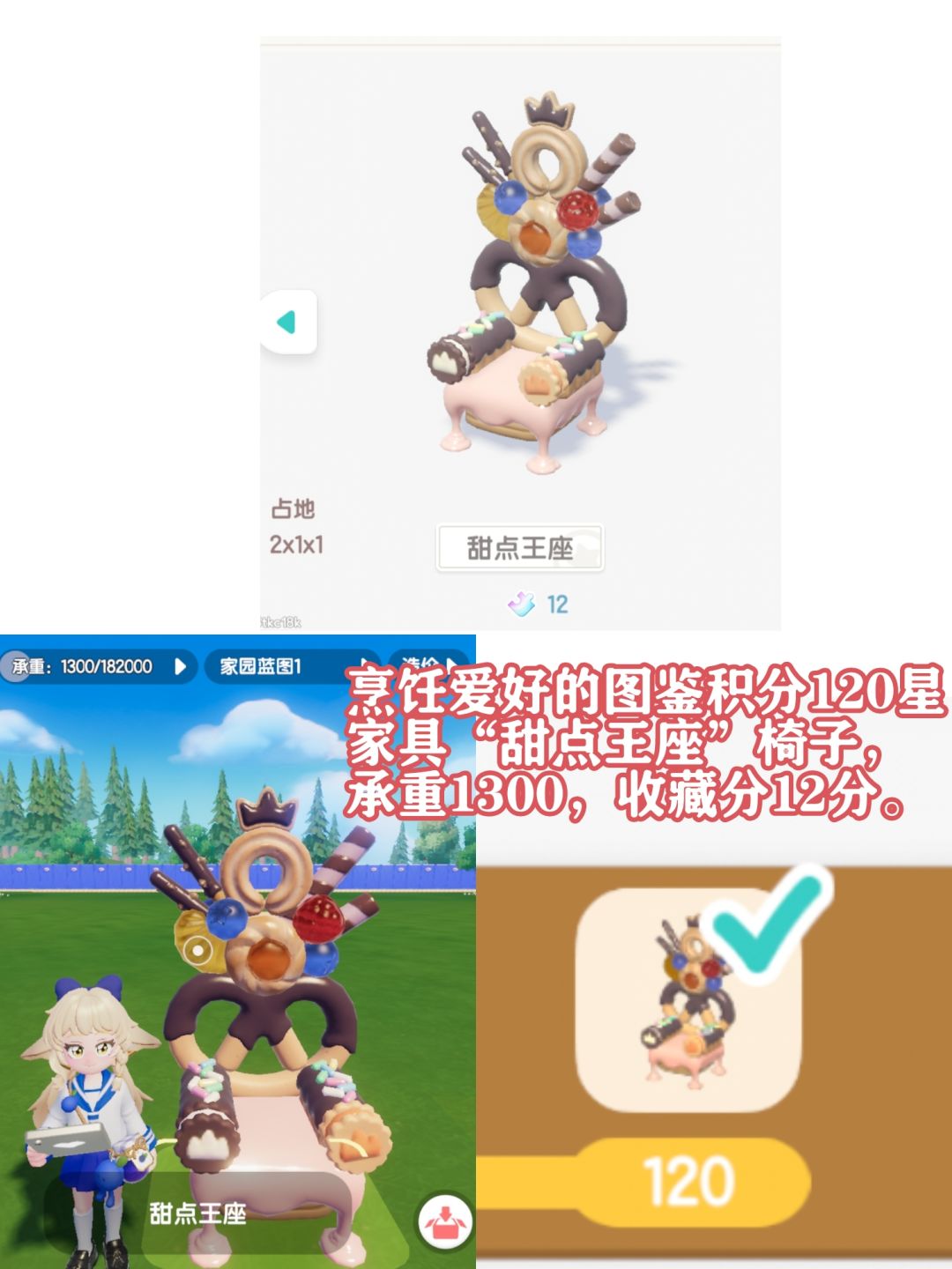 烹饪爱好的图鉴积分120星家具“甜点王座”椅子,承重1300,收藏分12分。
