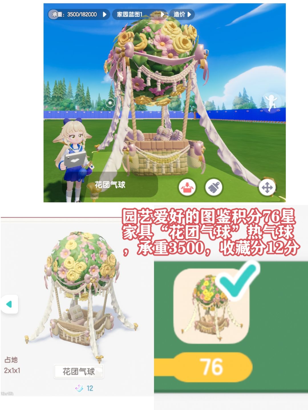 园艺爱好的图鉴积分76星家具“花团气球”热气球,承重3500,收藏分12分。