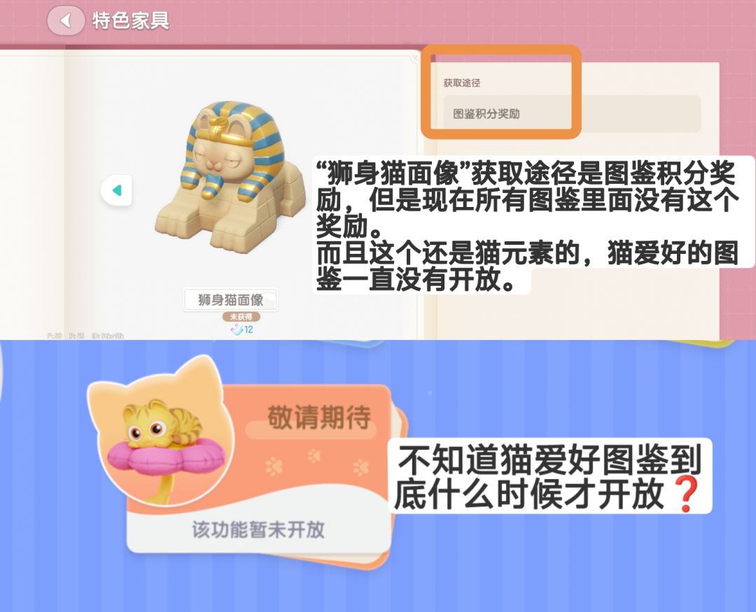 养猫爱好的图鉴未开放,最终家具应该是“狮身猫面像”。