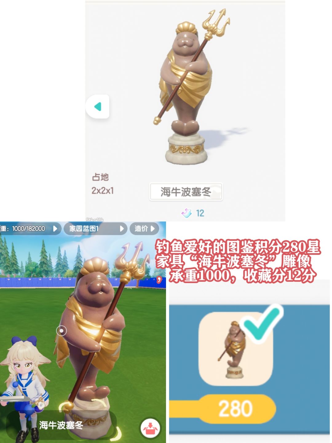钓鱼爱好的图鉴积分280星家具“海牛波塞冬”雕像,承重1000,收藏分12分。