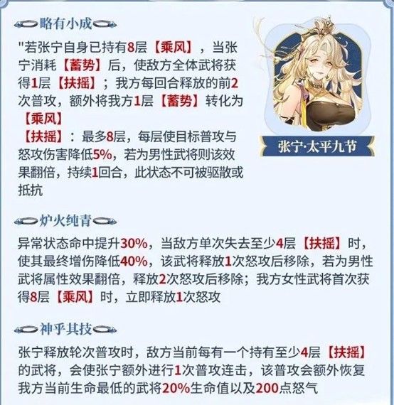 加快我方武将将“蓄势”转化为“乘风”的效率,能让“蓄势”更快的发挥作用。同时让张宁自身消耗的“蓄势”可以额外降低敌方的普攻怒攻伤害,作为女团特色的补充,对男性武将能降低更多。