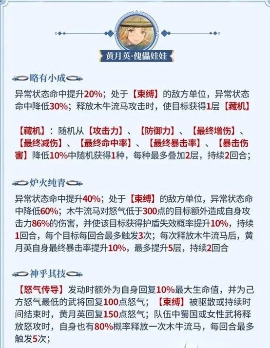 (2)炉火纯青 提高异常命中,对“束缚”单位则额外再降低海量异常抵抗,提高“木牛流马”对特定目标的伤害,概率削除其护盾。与此同时,还能额外再提高一下黄月英自身的最终暴击率。降低异常抵抗还可以看作辅助其他队友,至于提高的伤害和暴击率,给月英自身远不如给其他队友,她输出资质太差,聊胜于无。