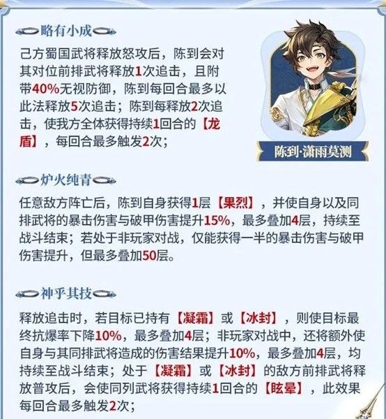 陈到出场率虽然不高,但是也有过高光时刻。在曾经的版本,凭借着还不错的技能组,在蜀国阵容中能有一席之地,虽然也避免不了逐渐被淘汰。