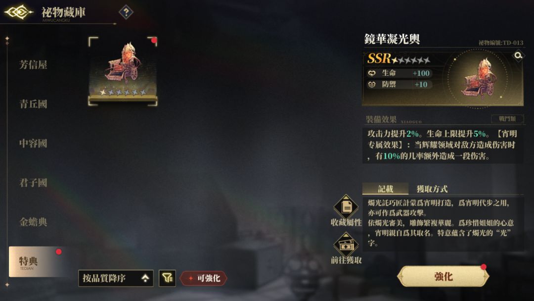 镜华凝光舆:攻击+10%,生命+5%,(10%/12%/14%/16%/18%/20%)的概率使辉耀领域额外触发一次伤害