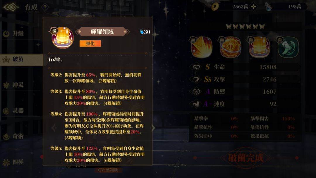 技能三:辉耀领域 消耗:30灵气 技能效果:展开辉耀领域,每当敌方行动时对其造成宵明攻击(50%/65%/80%/100%/125%)的直接伤害,宵明每减少20%的生命额外造成宵明攻击20%(4蝶15%,6蝶10%)的伤害,并为自身附加生命值10%的护盾(护盾效果不叠加)。敌方每受到6次辉耀领域的影响,则为我方全队提供15%(5蝶20%)的行动条。为处于辉耀领域中的全体友方提升10%(5蝶20%)的效果抵抗(2蝶开局释放该技能)