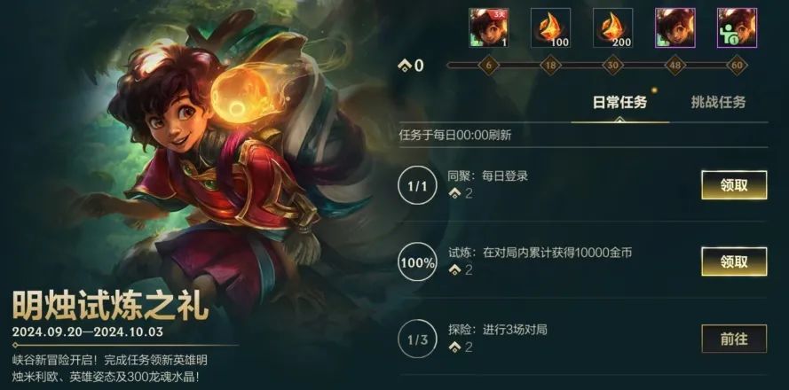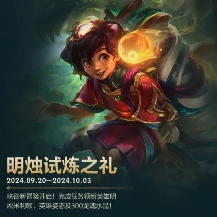 新英雄燃情登场,峡谷新冒险开启!即日起至10月3日,召唤师完成活动任务,即可领取新英雄明烛 米利欧、姿态-托腮及龙魂水晶*300好礼~