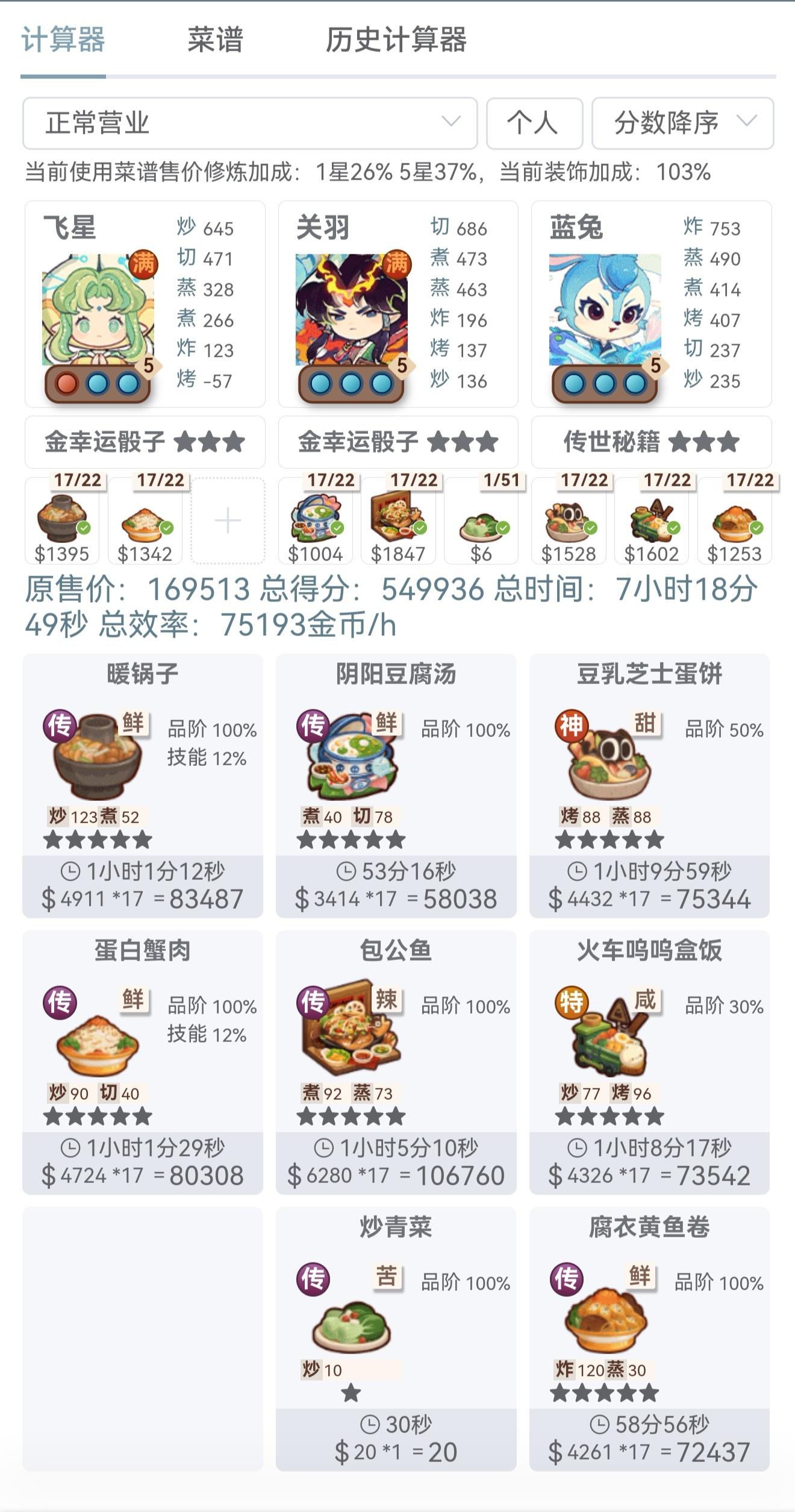 假设以此6道菜谱每日8点-24点不间断刷符文,组合当前版本主流贵客厨及厨具,排序如下: