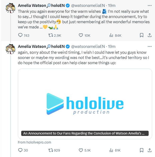Hololive旗下针对英语圈推出的VTuber团体「hololive English」中,-Myth-成员华生·阿米莉亚今日宣布即将停止所有官方活动,预计将于9月30日进行最后一场毕业直播。