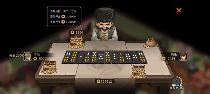 手游的赌坊真离谱,庄家和主角互相赢就能一直刷钱,每一局都会加多钱的倍率,只要庄家不是一直输就不会封盘而且会不断的刷npc来参加赌局堆倍率,参加的npc进来的钱也会越来越多,我最后参加到55局结束了