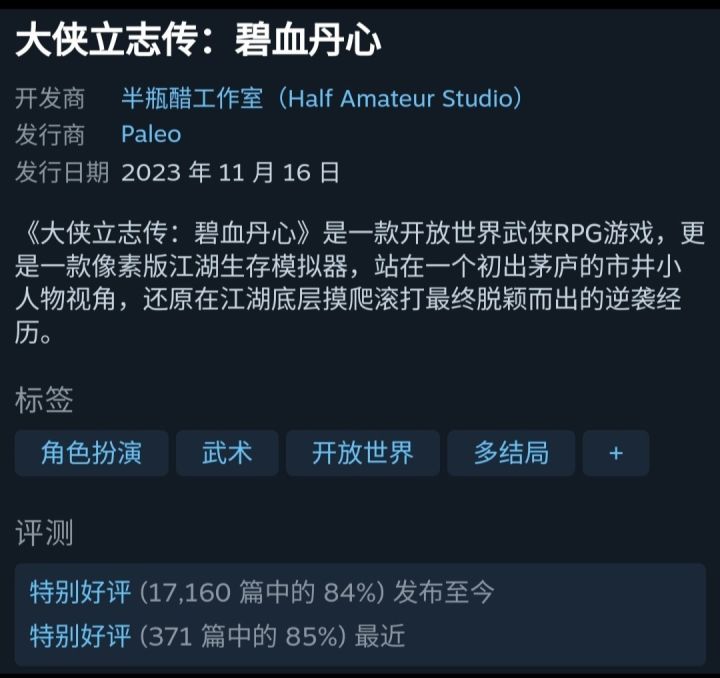 《大侠立志传:碧血丹心》是半瓶神仙醋在武侠上的最新力作,是一款开放世界武侠RPG游戏,像素风+战旗玩法+较高的自由度让这款游戏在武侠游戏中走出了自己的风格,目前该游戏在steam上的评价为多半好评,在大白箱评分上为8.3分,主要还是因为剧情雷点事件导致的一波评分骤降。![[表情_吃瓜]](https://img-tc.tapimg.com/market/images/d07b262774c8a022a7dddbc39683da6b.png)