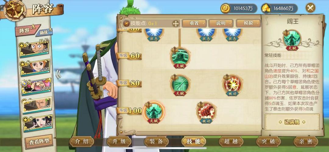己方所有草帽团角色速度提升40%,为己方其他草帽团角色分摊80%伤害,索隆辅助与肉坦的当担位置。