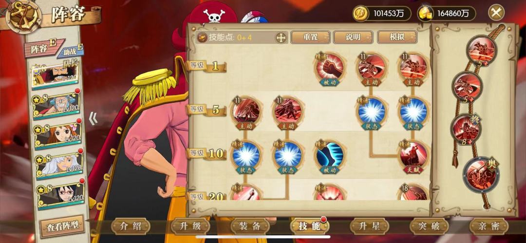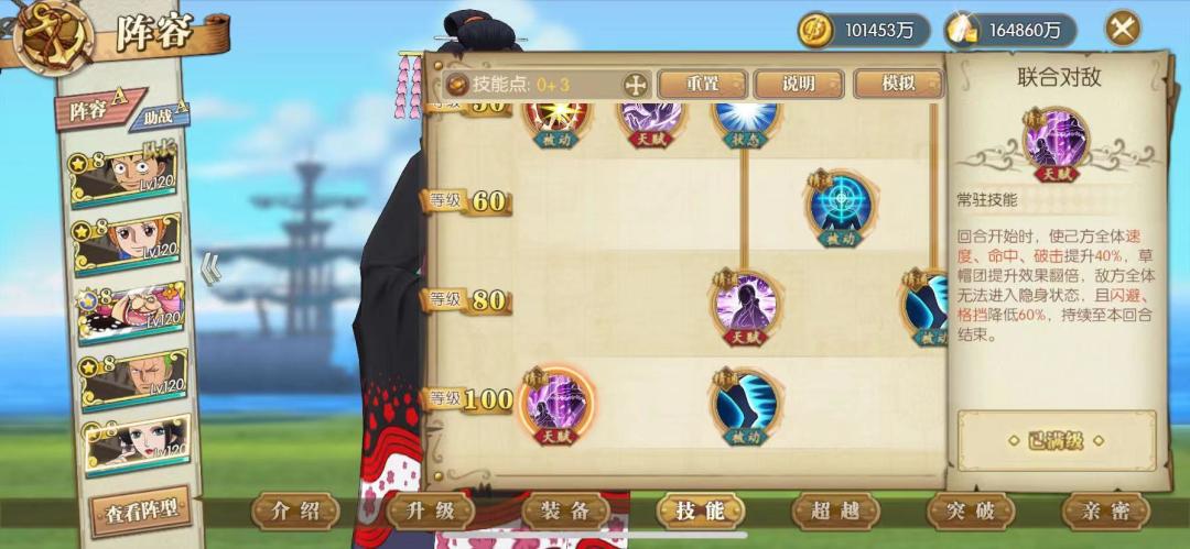 己方全体速度、命中、破击提升40%,草帽团提升效果翻倍。罗宾为草帽提高生存与属性面板效果。
