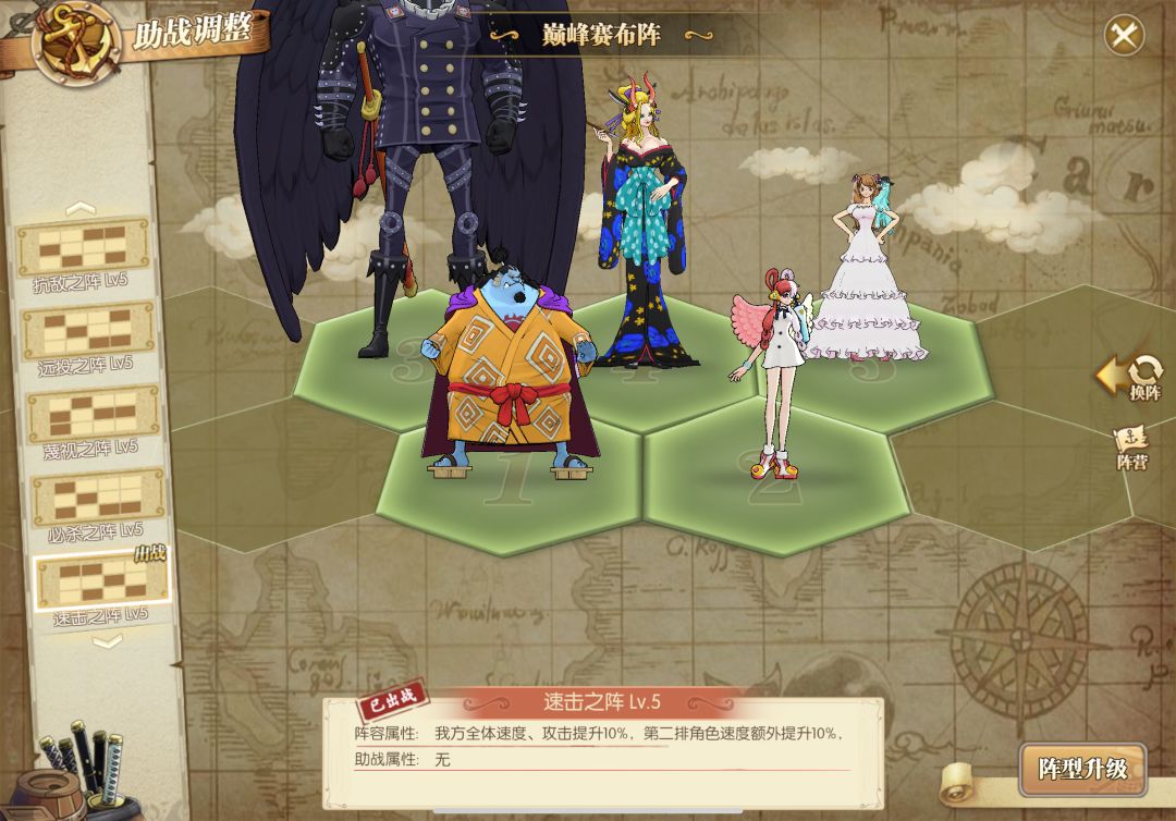 搭配全员草帽团核心是能不断地叠加草帽团的各项面板属性,让罗杰在吸取的过程中,能获得更多属性数值,让罗杰能更快的出手,天下武功,为快不破,全员草帽团为罗杰打辅助,当然搭配甚平上场也是可以的。助阵以加攻加速为主!