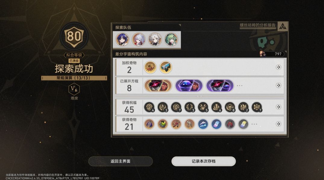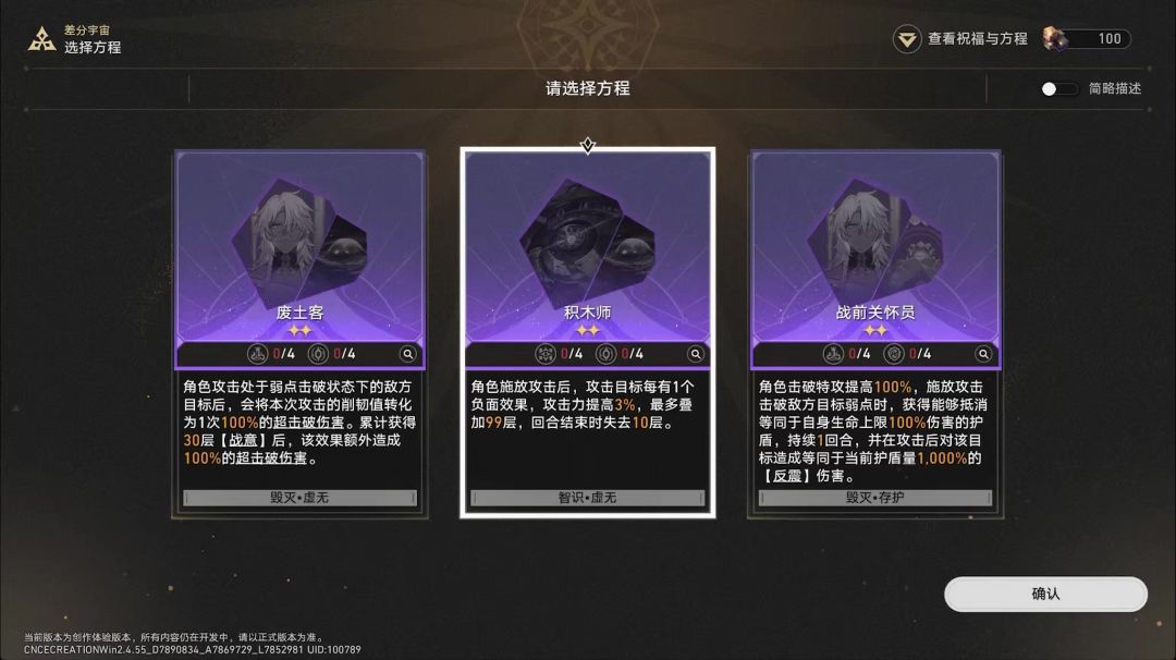 【临界方程】看着相当唬人,但实际上你几乎不可能激活得了这玩意 ——16个同一命途祝福,即使是在流程更长的【黄金与机械】中都不一定凑得够,更何况是流程相对比较短的【差分宇宙】。而且,由于【祝福覆写】功能的存在,同一命途的祝福在绝大多数情况下都不会超过10个——因为激活正常【方程】的祝福撑死要8个,多出来的不如【覆写】成其他命途的祝福,以便激活更多的【方程】。因此——这么个【临界方程】基本上也就只在运气爆棚能吃上阮饭的时候才会用得到了,激活优先级极低。