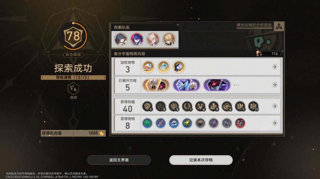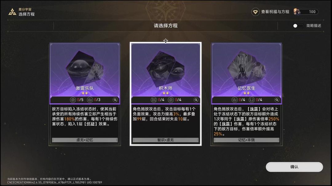 【临界方程】看着相当唬人,但实际上你几乎不可能激活得了这玩意 ——16个同一命途祝福,即使是在流程更长的【黄金与机械】中都不一定凑得够,更何况是流程相对比较短的【差分宇宙】。而且,由于【祝福覆写】功能的存在,同一命途的祝福在绝大多数情况下都不会超过10个——因为激活正常【方程】的祝福撑死要8个,多出来的不如【覆写】成其他命途的祝福,以便激活更多的【方程】。因此——这么个【临界方程】基本上也就只在运气爆棚能吃上阮饭的时候才会用得到了,激活优先级极低。