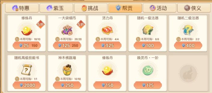 2. 帮贡兑换每周可以用帮贡兑换10个5折修炼丹,如果你的帮贡多,可以150帮贡换一个,但是不推荐,比较浪费帮贡,还不如用铜币点修。