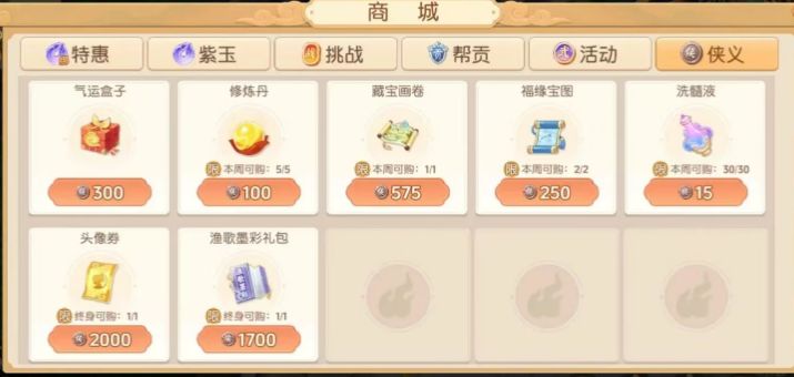 3. 侠义值平时帮助别人杀天师、妖王和藏器阁,送东西都可以积累侠义值,侠义值很好获取,侠义值每周可以兑换5个修炼丹,100一个。
