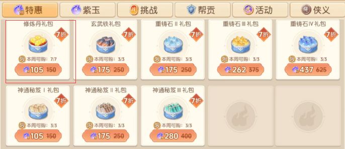 1. 绑玉购买 修炼丹礼包105绑玉5个,三卡玩家必买的礼包,一周35个修炼丹,绑玉在游戏中很好获得,很多活动都可以拿到,即使是0氪玩家,也不用担心自己缺绑玉买不了每周修炼丹礼包。