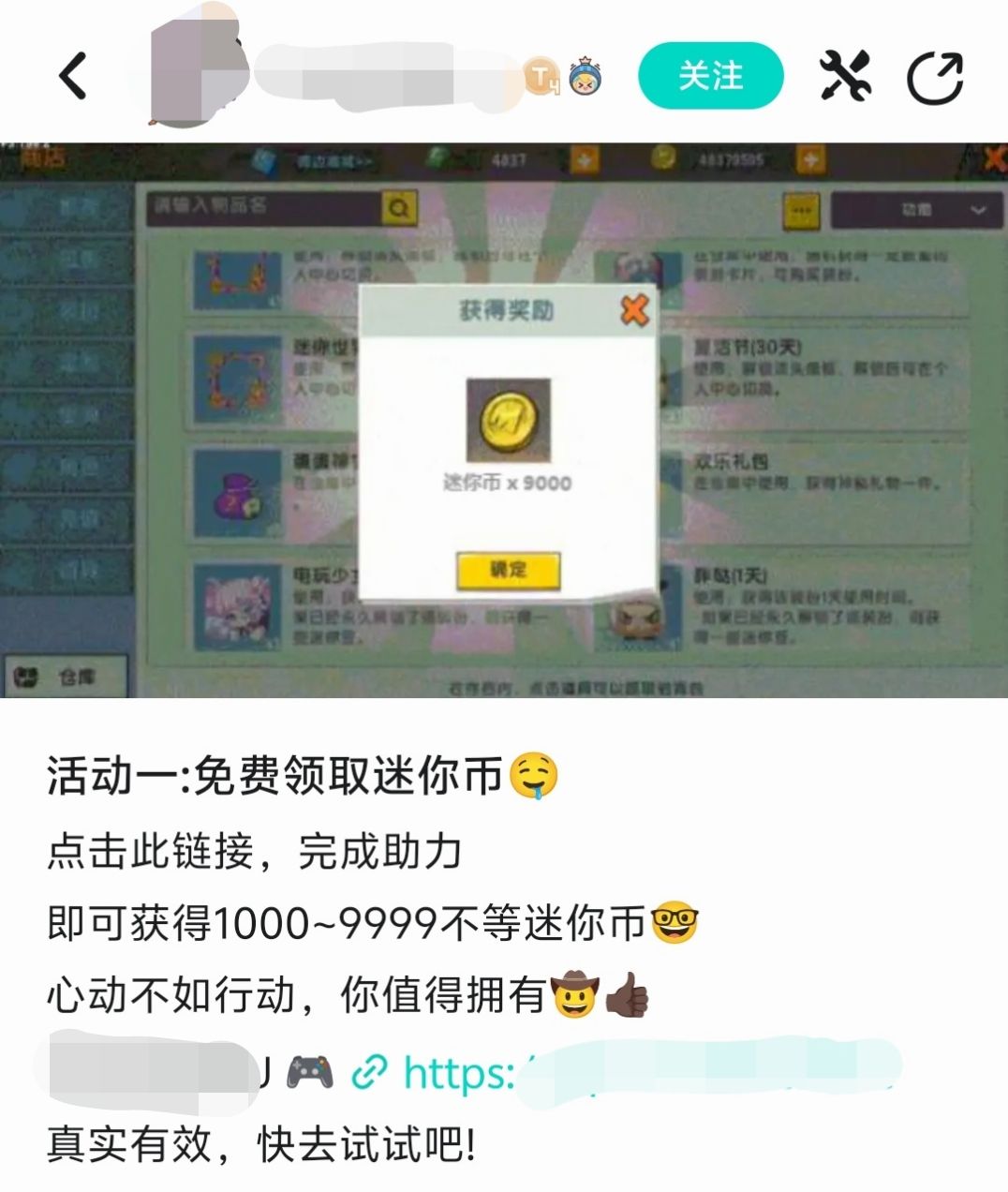 内容均为欺骗用户点击链接即可领取迷你币等虚假宣传,诱导用户进行游戏助力