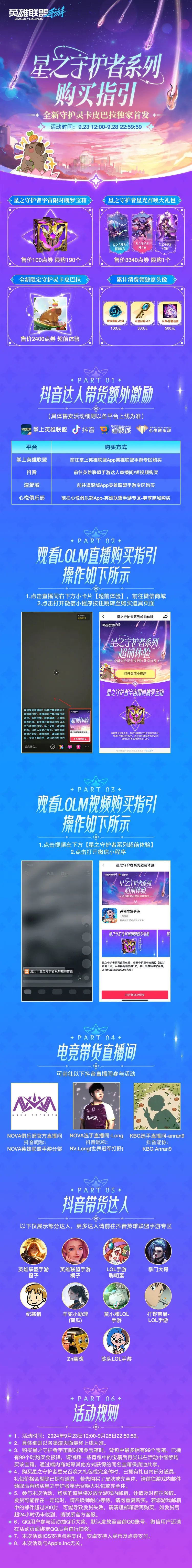 9月23日12:00-9月28日22:59分(具体售卖活动细则及时间以各平台上线为准),星之守护者系列皮肤及全新卡皮巴拉限定守护灵开启超前体验!召唤师前往掌上英雄联盟、抖音、道聚城、心悦俱乐部购买即可享受专属折扣,水晶秘钥最低8折起,更有独家头像等多重好礼~