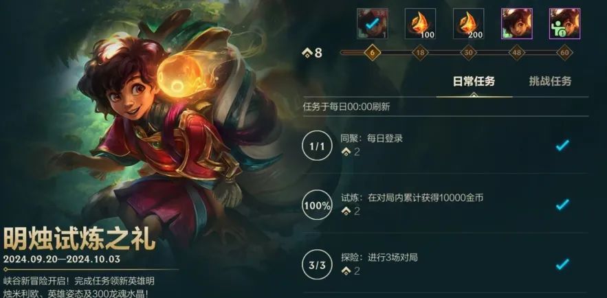 峡谷新冒险已经开启,截止至10月3日,完成活动任务即可领取新英雄明烛 米利欧、姿态-托腮、龙魂水晶*300奖励!