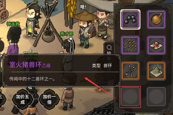 (2)江南怪每日午时开启拍卖,卖品包含毒药和暗器,隐藏卖品为室火猪兽环,进入拍卖后鼠标移到空白处可提前得知拍卖品是否包含兽环,价值约23贯左右,被NPC买走几乎就没法找回来了。因此,参加拍卖前务必做好准备。(重要)