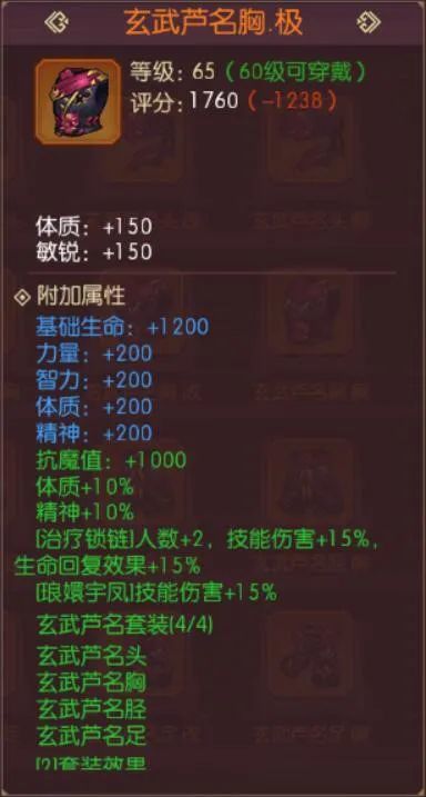 这套搭配方案应该是当下神乐的主流搭配,能够极大地弥补70级防具套装在辅助能力上的缺陷,玄武衣服的体制增幅能够提高神乐在副本中的治疗量,精神增幅能够提高神乐勇气祝福、落日余晖的增益数值,对于团队输出的提高尤为重要。