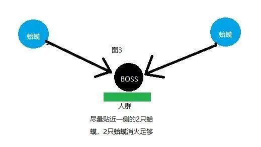 BOSS通身呈红色,壬无月斩红郎身边的火圈会随着时间的增加而增加,而蛤蟆吐出的冰块可以为BOSS“消火”(引蛤蟆的玩家可以通过蛤蟆吐冰块的红条颜色变淡和蛤蟆嘴型变化判断翻滚时机),参考以下图片,2神乐与4输出站在同一侧,这样方便神乐为4个输出位加上【勇气祝福】的BUFF,首饰套装的增益效果也会在该范围内生效,同时又能够使6个玩家都享受到【神远祈音】的回血效果,保障队友的输出量以及生命值足够将BOSS的血条压至3000即可。