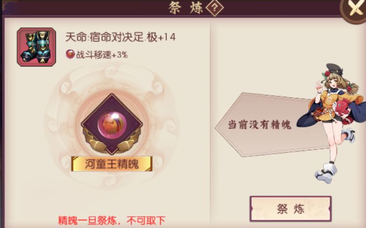 既然提到了装备,那么装备祭炼的精魄肯定是必不可少的,论坛上也有很多玩家对于神乐的精魄祭炼给出了很优秀的答复,笔者只在这里补充一点,头盔和鞋子所祭炼的如果不是300基础防御+300独立防御,是可以换成3%移动速度的河童王精魄。