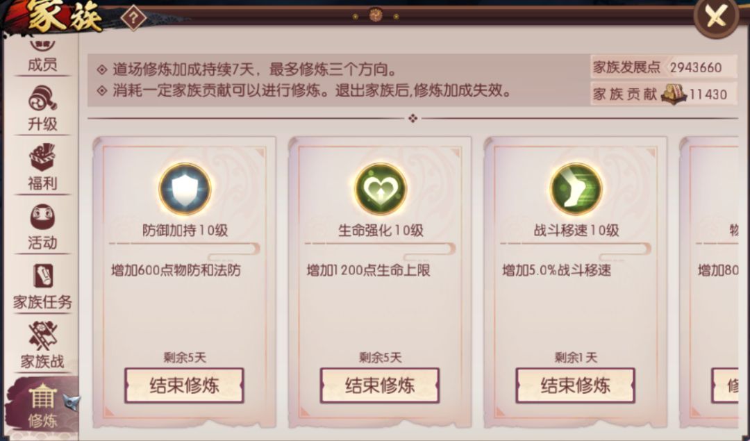 首当其冲的就是家族修炼板块了。在家族修炼这一板块中,每个玩家都可以选择最多3个方向的属性增益进行修炼,而神乐作为一个辅助职业,所选择的属性增益与其他输出职业是完全不同的。相比于基础攻击、双暴、属强这些增加输出的属性,神乐选择生命强化、移动速度、双防的收益会更高。