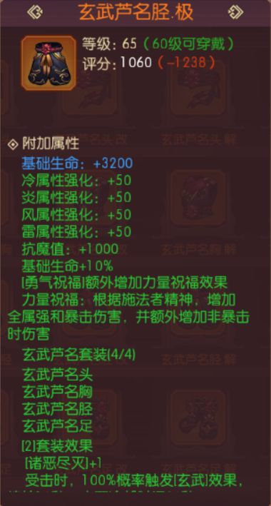 而玄武芦名胫的移速加成与天命·宿命对决足的移速加成使一致的,但是玄武芦名胫对于【神远祈音】的冷却效果更佳,不过在天命套装的两件套效果中技能冷却时间-5%的全局收益更高。