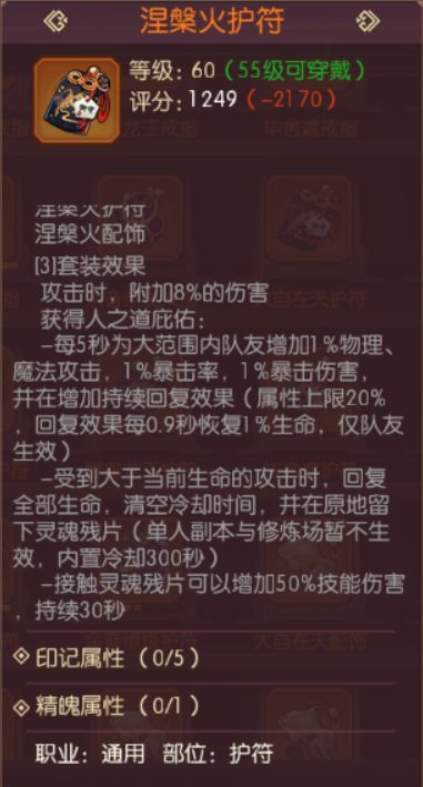 涅槃首饰在仙峰首饰成型之前就是辅助流神乐的首选地藏首饰套装,最高属性增益20%双攻、20%双暴,以及0.9秒回复1%最大生命值,在这些增益属性中,笔者认为20%双暴对于团队的提升应该是最为重要的,特别是一些做了黄昏、晨曦防具套装的输出职业而言,双暴的提升比较明显,20%双攻对于做了晨曦、黑夜防具套装的输出职业而言也是非常香的。