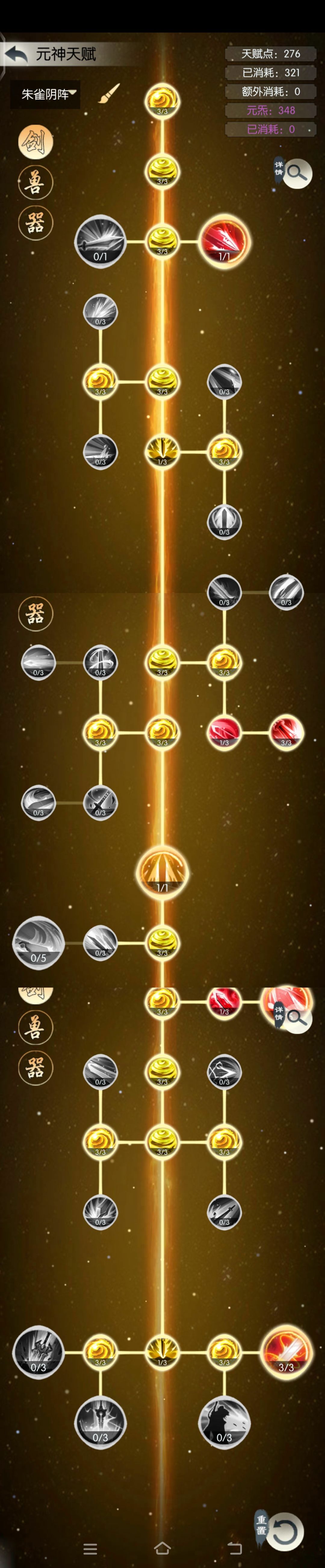 6,元神天赋:剑左边。注意:不点和命中闪避相关的天赋,我们正需要最多的不命中导致怪物“回春”技能在阴50作用下减血,同时“木身”不回血。命中太多会让怪“木身”回血变多,伤害缺口就更大。