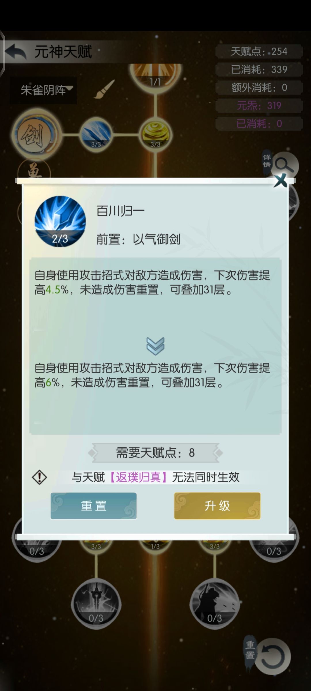 为了控伤,剑天赋“百川归一”我只点了两点,大家根据自己血量调整,最大伤害低于自身2倍血量即可